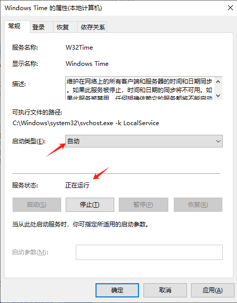 2.找到Windows Time服务,右键选择属性,启动Windows Time服务,并设置为自动启动,然后重启服务器主机。